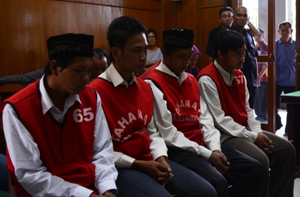 Empat orang terdakwa yang dijatuhi hukuman enam tahun penjara oleh majelis hakim Pengadilan Negeri (PN) Surabaya, Kamis (3/7) itu bernama Moch. Arwan alias Uweng (18 thn), Resyano Martin Prayitno alias Reza (22 thn), Dennis Miliarna alias Iman (19 thn), Moch. Amir alias Amek (25).