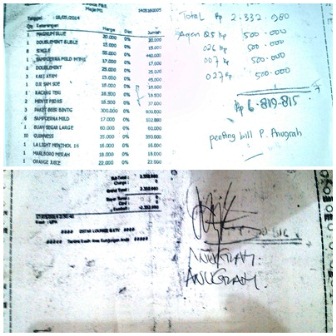 Sesuai tertulis di nota belanja, jumlah tagihannya mencapai Rp 6.819.815, dengan rincian Rp 2.486.835 dan Rp 2.332.835 untuk total makanan dan minuman sementara sisanya adalah untuk jasa empat cewek pemandu karaoke atau dikenal dengan istilah purel. Untuk masing-masing purel itu biayanya Rp. 500 ribu sehingga total biaya untuk empat purel adalah Rp. 2 juta. (pay)